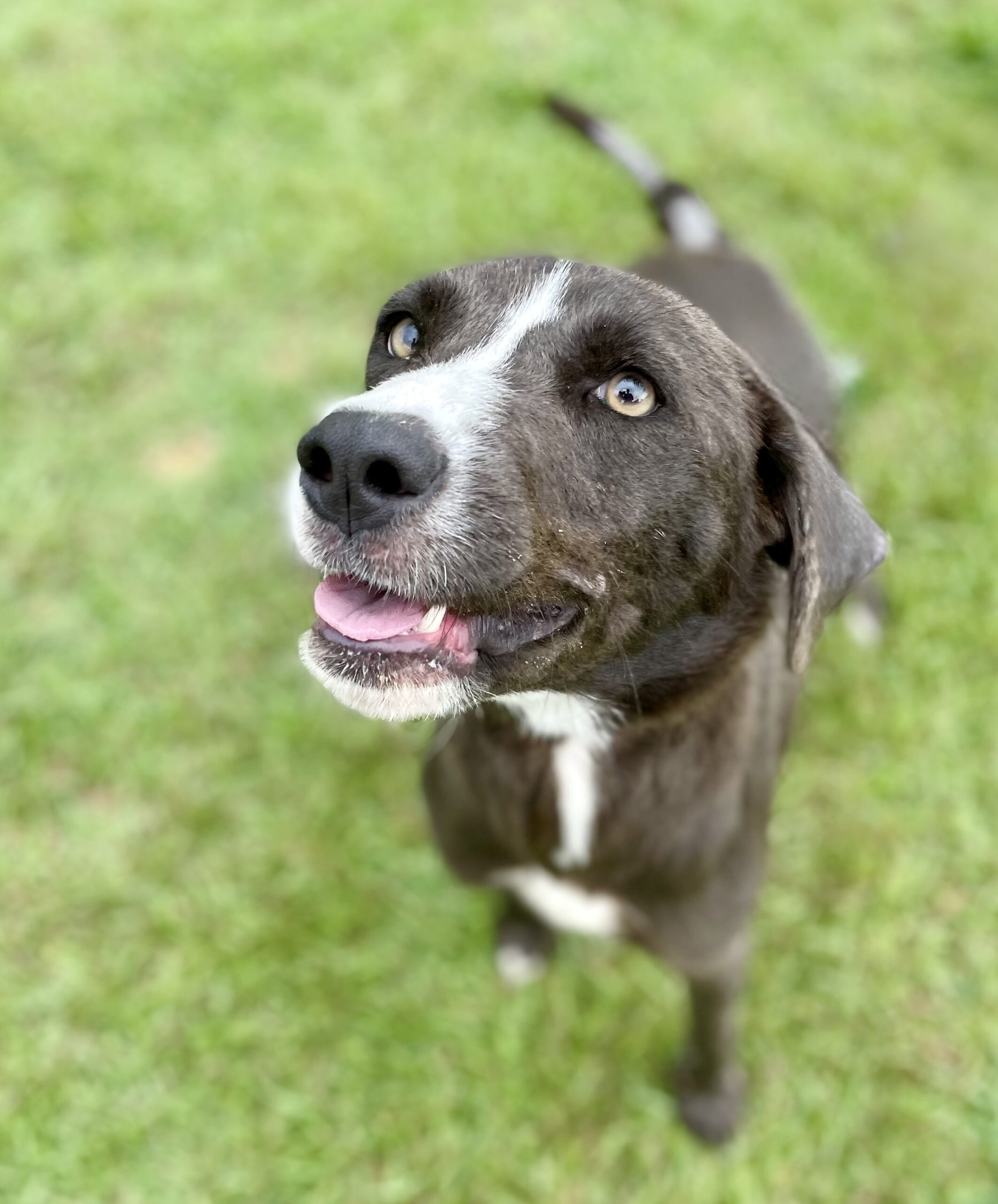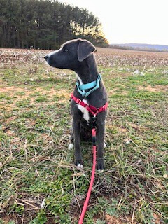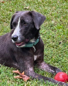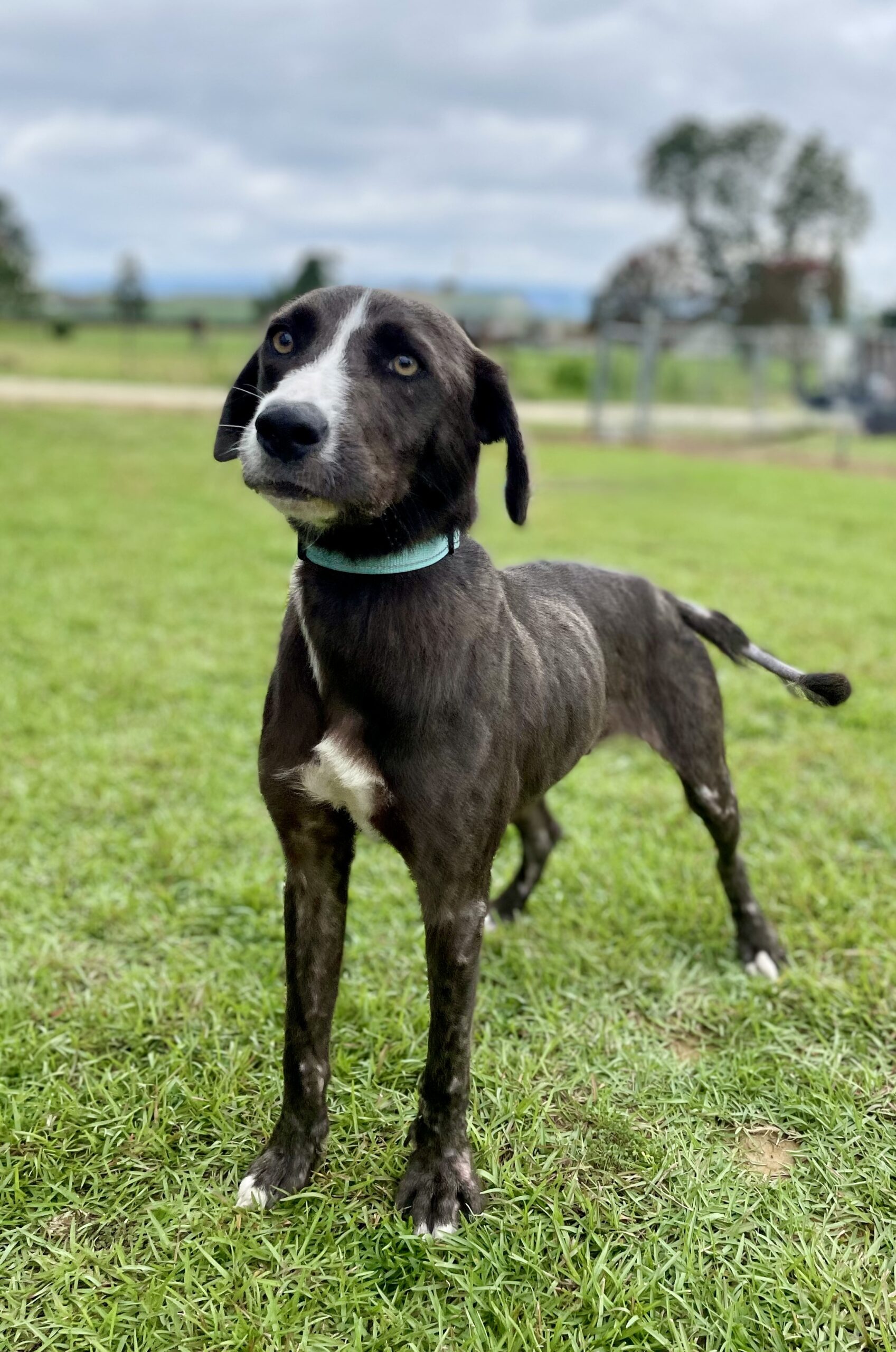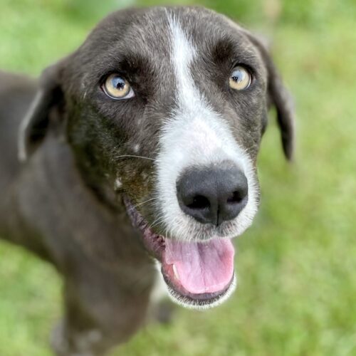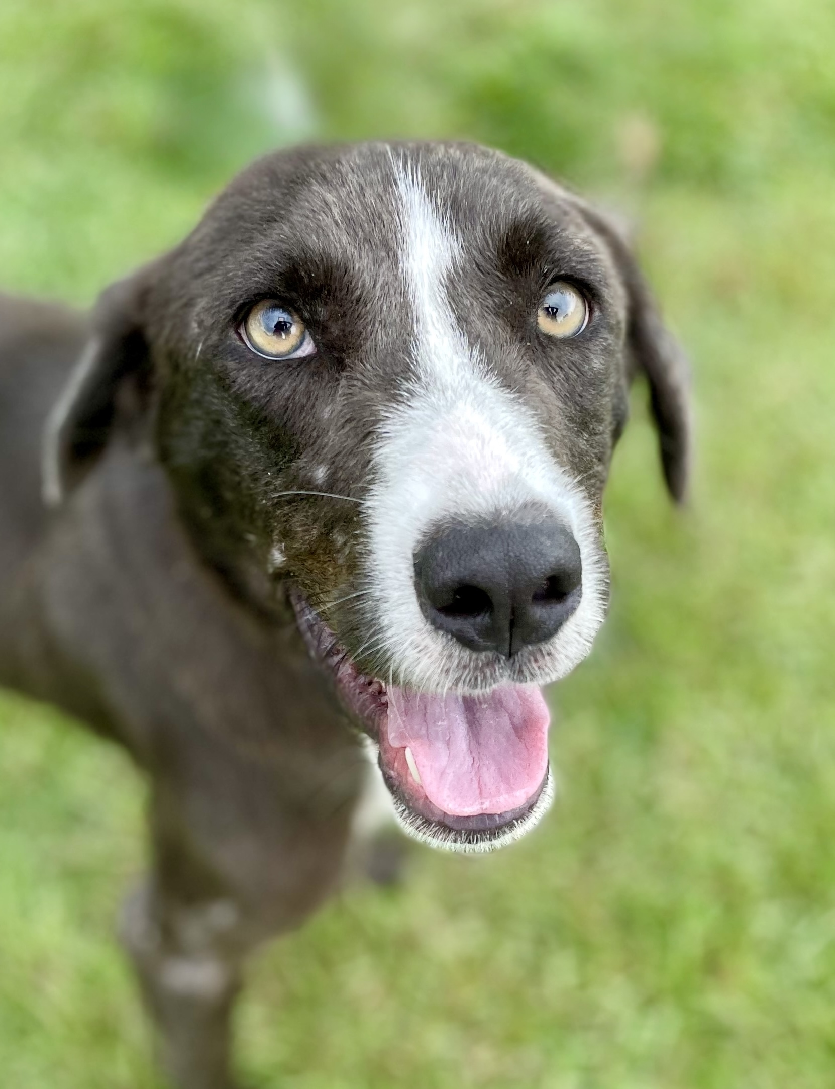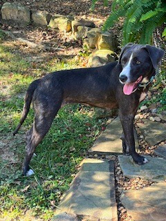 When Lovey was first found, she was a shadow of the dog she was meant to be. Emaciated, weak, and suffering from scabies, she had clearly been neglected for far too long. But even in her darkest moments, her gentle spirit still shined through — she never stopped hoping for kindness. With love, care, and a safe place to heal, Lovey transformed. Today, she is healthy, radiant, and living up to her name in every way. Her blackish-brown coat now glows, her golden eyes sparkle with joy, and her heart is overflowing with love to give. Lovey is a stunning one-year-old Pointer mix, standing tall and lean at about 40 pounds. She is intelligent, athletic, and eager to learn, the true spirit of a bird dog. She has already mastered “sit,” walks beautifully on a leash with her harness, and learns new commands quickly. Fetch is her favorite game, and she plays with enthusiasm (she’s still working on the “drop the ball” part, but she’s trying!). This sweet girl adores being around people and enjoys children of all ages. Lovey is friendly with other dogs and passes them politely on walks. True to her breed, she finds cats a bit too interesting and will happily chase squirrels, birds, and rabbits, so a cat-free home would be ideal. Lovey’s foster describes her as loving, joyful, and playful. She gives kisses freely, her tail never stops wagging, and she believes that every lap is meant for cuddling no matter her size. After everything she has endured, Lovey is ready for a forever family who will treasure her. She has a remarkable capacity to love, and she is so eager to share it with a family of her own. If you’re looking for a loyal, affectionate companion with a survivor’s heart and a playful spirit, Lovey is waiting to meet you.